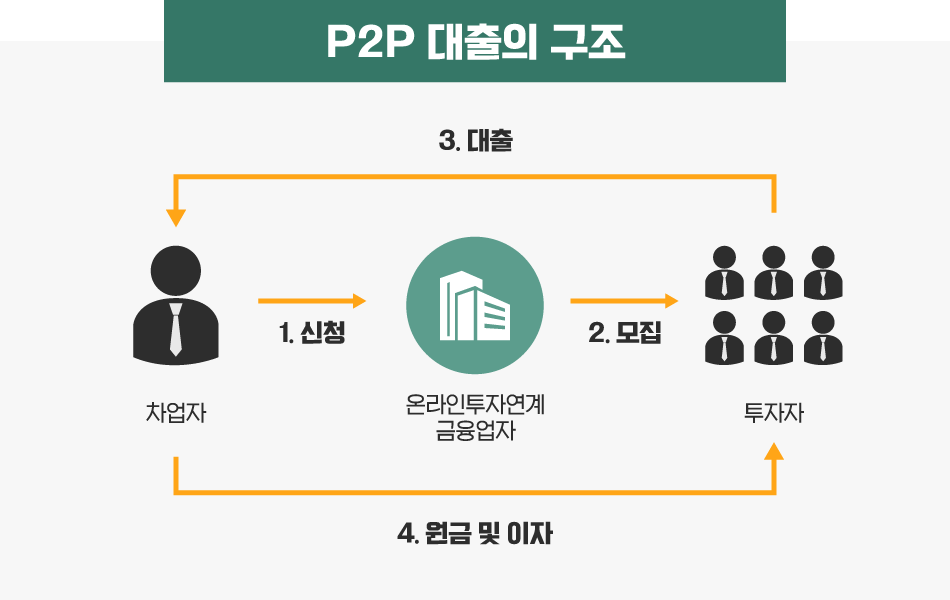 개인 혹은 다수의 투자자들이 자금을 필요로 하는 개인이나 기업에게 금융기관을 거치지 않고 온라인을 통해 자금을 빌려주는 거래 서비스를 의미합니다.
